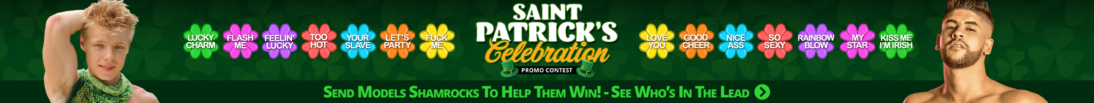 The luckiest day of the year is almost here! But it's not too late to propel your fine fella into the winner's circle! Send him a lusty love note in the form of a digital Shamrock and he might be crowned the St. Patrick's Day King! The luckiest day of the year is almost here! But it's not too late to propel your lovely lass into the winner's circle! Send her a lusty love note in the form of a digital Shamrock and she might be crowned the St. Patrick's Day Queen!